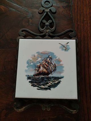 Particolare sottopentola vintage in ferro battuto e ceramica,con piedini di appoggio e adatto anche ad essere appeso,misure:32x17 cm,in ottime condizioni.Interessante. Prezzo fisso.
