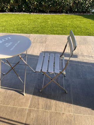 Set composto da un tavolino rotondo da 60 cm e due sedie in metallo, perfetti per arredare il tuo spazio esterno. - Tavolino rotondo con diametro di 60 cm. - Due sedie pieghevoli abbinate. - Struttura in metallo resistente. Usato ma in buono stato, qualche segno di ruggine. Consegna zona Besurica Piacenza