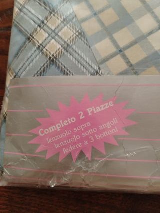 Completo letto matrimoniale in puro cotone:due federe,lenzuolo sopra e lenzuolo sotto,colore come in foto,vintage ma..nuovo,ancora nella confezione originale. Interessante. Prezzo fisso.