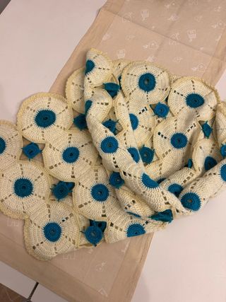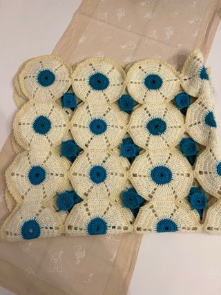 Coperta fatta a mano all'uncinetto con un design a fiori. - Motivo floreale con centro blu. - Bordi ondulati. - Realizzata in filato di cotone.