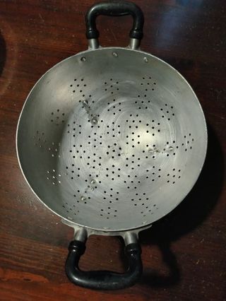 Grande scolapasta vintage in alluminio,misure:24,50 cm di diametro e 13,50 cm di altezza,manici in plastica dura,in condizioni piu' che buone.Interessante. Prezzo fisso
