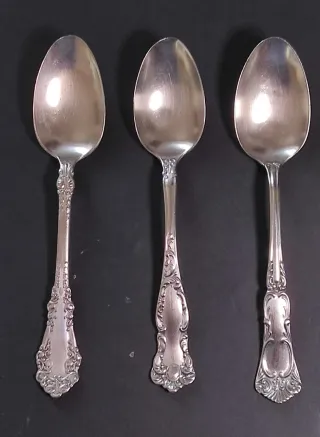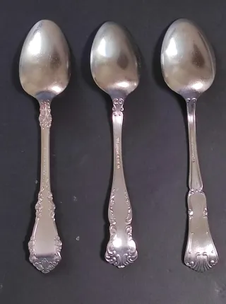 Set di tre cucchiai Rogers. - " 1847 Rogers Bros .6 " Il marchio indica il produttore ( International Silver Company ) e l' anno di fondazione della società, non l ' anno di produzione del pezzo specifico . Il 6 indica probabilmente un tipo di placcatura o un numero di serie - " WM Rogers e Son AA " William Rogers ha iniziato la sua attività nel 1825 e l' azienda ha operato fino al 1931 . Il marchio AA indica la qualità della placcatura in argento - " 1881; Rogers A1;" È un noto marchio di posate placcate in argento, originariamente prodotto da Oneida Limited . A1 spessore della placcatura