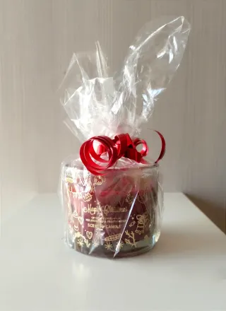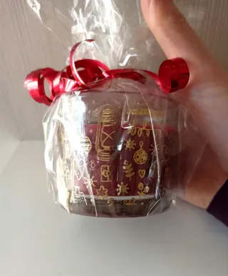Candela profumata Magic Christmas con decorazioni dorate. Contenitore in vetro. Profumo di melograno e frutti rossi. Altezza vasetto 6 cm, diametro 6.5 cm.