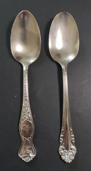 Set di due cucchiai placcati argento della Oneida Community AI , storico marchio di posate fondata nel 1848 nello stato di New York . Particolare il cucchiaio che presenta un manico riccamente decorato con motivi floreali e a onde in rilievo e reca l'incisione California sul manico. Questi cucchiai sono considerati oggetti di valore per la loro rarità e il loro significato storico . Per amatori o collezionisti