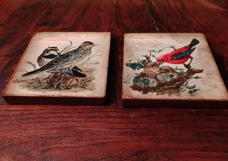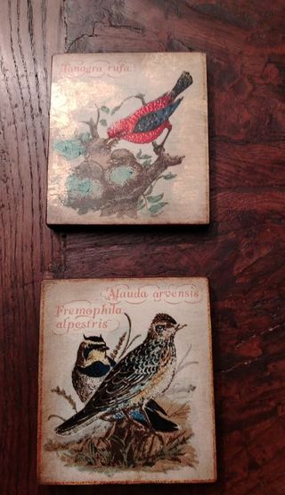 Due quadretti gemelli in legno raffiguranti uccellini,misure:15x13x2 cm,in perfette condizioni.Belli! Prezzo fisso.