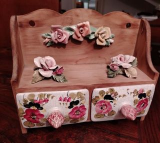 Mensolina in legno con roselline e cassettini in ceramica,misure:24x18x14 cm,in perfette condizioni,stile shabby chic,romantica e molto molto bella! Prezzo fisso.