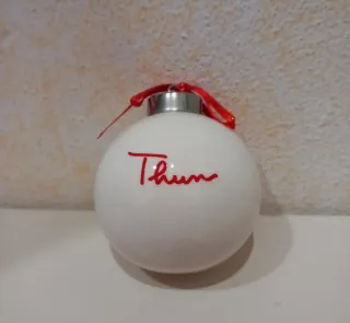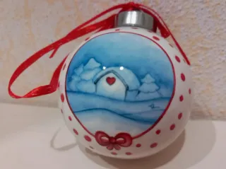 Pallina decorativa Thun per il periodo natalizio, con un'adorabile scena invernale. - Raffigura una casetta innevata con un cuore rosso. - Decorata con pois rossi e un fiocco. - Completa di nastro rosso per appenderla.