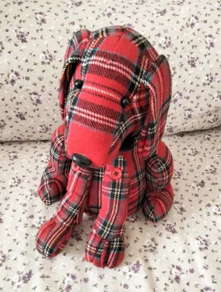 Dolcissimo cane fermaporta o decorativo, in tessuto rosso scozzese tipo kilt, con simpatico papillon nero e lunghe orecchie abbassate. È alto circa cm 30 e la larghezza comprese le zampe è di circa cm 25.