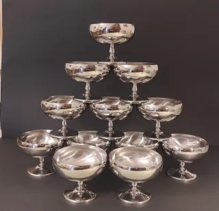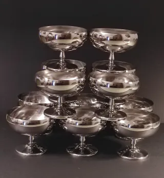 N.12 coppe in acciaio inox , design classico ed elegante , ciotole rotonde e lucide , con base che le sostiene , storicamente utilizzate per servire gelato , macedonia e dolci al cucchiaio . Realizzate in acciaio inox , quindi robuste e sicure per alimenti , lavabili in lavastoviglie. Come si evince dalle foto, tutte le coppe esternamente sono perfette e senza righe , mentre internamente si presentano un po' graffiate, un piccolo segno di usura causato dai cucchiaini di utilizzo . Diametro cm 11 , altezza cm 9