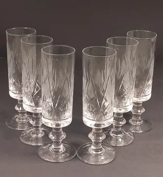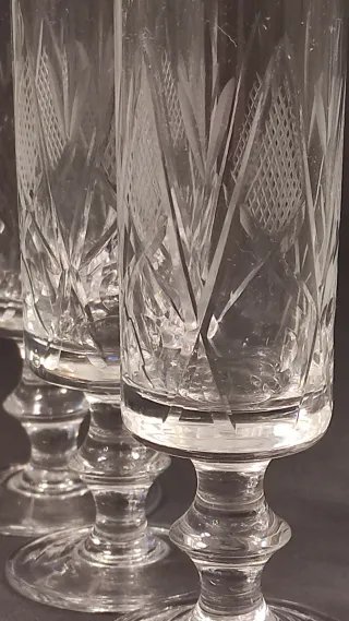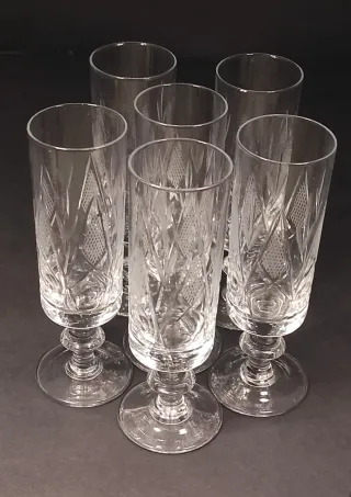 N.6 bicchierini in cristallo intagliato da liquore . Il cristallo si distingue dal vetro per l'aggiunta di ossido di piombo che ne aumenta la brillantezza e la capacità di rifrangere la luce . Infatti questi bicchierini presentano una elevata trasparenza ed un caratteristico suono squillante se percosso . Motivi decorativi e intricati intagli , conferiscono un senso di eleganza ed un sofisticato design . Come nuovi , tutti perfettamente integri . Vintage anni 70 . Altezza cm 14 , diametro bicchierini cm 4 , diametro basi cm 5 .