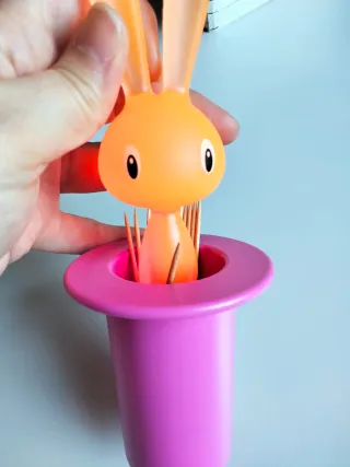 Simpatico portastuzzicadenti a forma di coniglietto, "Magic Bunny" marca Alessi, disegnato da Stefano Giovannoni. Un tocco di allegria per la tua tavola! In resina termoplastica, rosa e arancio. È stato usato tre o quattro volte, come nuovo. - Design giocoso e originale. - Materiale resistente e facile da pulire.