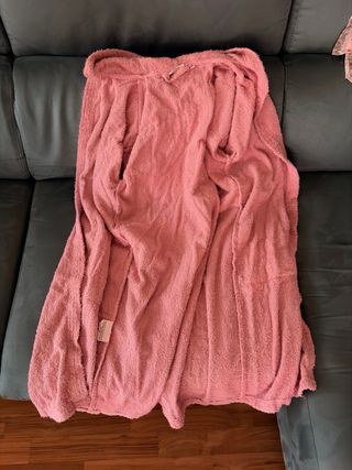 Morbido accappatoio rosa in taglia M, perfetto per rilassarsi. - Tessuto in pile soffice al tatto. - Cintura per chiusura. - Cappuccio integrato.