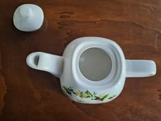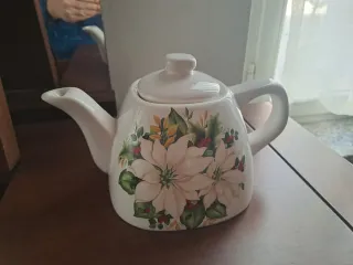 Teiera in ceramica con un bellissimo decoro floreale natalizio. - Motivo con fiori bianchi e foglie verdi. - Dettagli con bacche rosse.