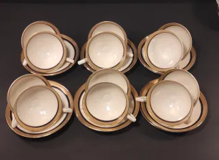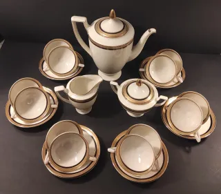 Servizio caffè porcellana manifattura tedesca Royal Selb , il marchio H sovrastato da una corona indica la produzione di Heinrich & Co. a Selb in Baviera , città rinomata per questa produzione . Porcellana colore avorio impreziosita da decorazioni in oro zecchino incrostato e lavorato e bordi in blu cobalto . Il set comprende : - 12 tazzine caffè ( diametro cm 9 , h cm 5 ) - 12 piattini ( diametro cm 13 ) - 1 caffettiera - 1 lattiera - 1 zuccheriera con coperchio Vintage anni 60 , può essere utilizzato in una occasione importante o come elemento decorativo per evocare un senso di qualità e prestigio Come nuovo