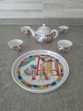 Servizio cinese per sakè con piatto, teiera e 4 bicchierini. Uno ha un segno di fabbricazione all'interno visibile nelle foto.