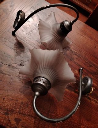 Coppia di appliques vintage in vetro satinato e metallo brunito,in ottime condizioni,diametro fiore:18 cm,ingombro totale verticale:34 cm. Richiedono una accurata pulizia,comunque il vetro e' fume'. Interessanti! Prezzo fisso. Nota:spedizione in sicurezza.