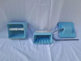 Set di accessori da bagno vintage in ceramica blu con dettagli in acciaio cromato. Realizzati negli anni '70. - Dispenser di carta igienica con porta rotolo (piccolo difetto nella parte superiore. Vedere foto 4) - Portasapone. - Porta asciugamani. Per piastrelle da 24,5 cm. 10 € / unità. 28 € lotto completo.