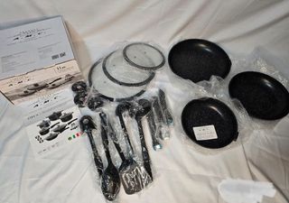 Set di pentole in pietra lavica AMC da 23 pezzi, ideale per la tua cucina. Adatto a piani a: Gas elettrico Induzione alogeno. Contenuto del set: 1) Casseruola 20cm /2,3Lt 1) Casseruola 24cm/ 4,5Lt 1) Casseruola 28cm/ 6,5Lt 1) Pentolino 16cm/ 1,3Lt 1) Padella 24cm/ 2,4Lt 1) Padella 28cm/ 3,4Lt 11) utensili da cucina. - Design tedesco. - Rivestimento antiaderente. - Materiali di alta qualità.