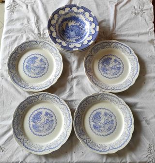 Grazioso servizio da tavola in porcellana mix & match per 6 persone, composto da 6 piatti piani + 6 piatti fondi. Ci sono 3 grandi piani Johnson Brothers e 3 piani senza marchio uguali a Bernadette di Sarreguemines; poi 3 fondi con decoro di festa in stile inglese + 1 fondo EIT ENGLAND con paesaggio inglese + 2 fondi manifattura imperiale di Nimy con fantasia grafica in bianco e blu. Le condizioni sono in generale ottime. Segnalo su uno dei piatti Boch un piccolo restauro dello smalto che si era un po' sgranato (praticamente invisibile, foto 4) e un restauro sotto a un piatto Johnson foto 9. Per il resto, smalto eccellente!