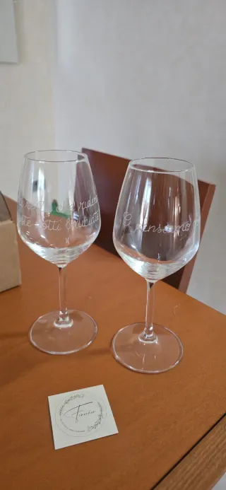 Set di due calici in vetro con incisioni a mano. Perfetti per occasioni speciali o come regalo unico. - Incisioni personalizzate. - Design elegante. Bellissima idea regalo personalizzata. Incisa a mano. Marca Fennidea. Vendo per inutilizzo. Scritta su un calice: "non ci resta che ridere in queste notti bruciate". Frase di una canzone Angelina Mango. Nell'altro calice: ci pensiamo domani. Canzone Angelina Mango. Valore ogni calice di 27 euro. Vendo entrambi a 40 euro. Mai usati, nuovi. (Ripostiglio)