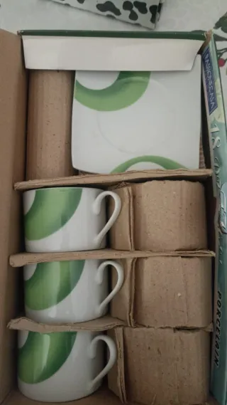 Elegante set di 12 tazzine da caffè con piattini vintage, perfette per gustare il tuo espresso. 1 Set composto da 6 tazzine e piattini color carta da zucchero 1 Set 6 tazzine bianche e gialle con delicati fiori blu. Nuove, mai utilizzate. Scatole rovinate. Si possono vendere anche separatamente. Idea regalo 🎁 - Design classico con finitura azzurra. - Ideali per un tocco di stile sulla tavola.