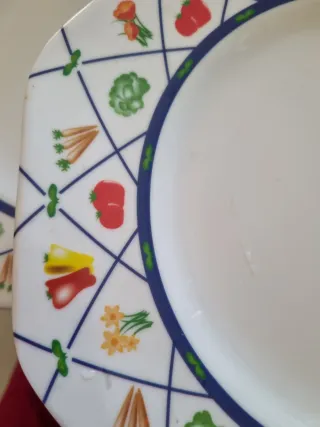 Set di tre piatti in plastica con un allegro decoro a tema verdure. Perfetti per aggiungere un tocco di colore alla tavola. - Design ottagonale. - Bordo decorato con verdure colorate e motivo a griglia. - Colori vivaci e allegri larghezza 24 Marchio Galaxy Castelverde (periferia est di Roma)