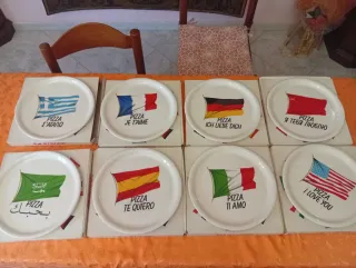 Set completo di 8 piatti da collezione Standa, ognuno raffigurante una bandiera diversa con la scritta Pizza nella lingua corrispondente. Completo di scatole, kg 5 in totale. - Piatto Grecia: Pizza S'agapo - Piatto Francia: Pizza Je t'aime - Piatto Germania: Pizza Ich liebe dich - Piatto URSS: Pizza Ya tebya lyublyu - Piatto Arabia Saudita: Pizza Bahbak - Piatto Spagna: Pizza Te quiero - Piatto Italia: Pizza Ti amo - Piatto USA: Pizza I love you