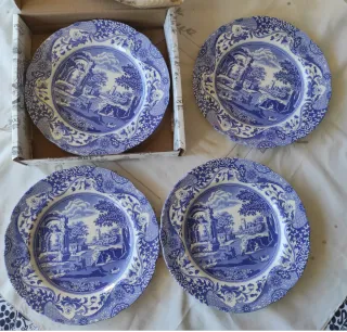 4 piatti diametro 23 di Spode Decoro Blue Italian, il piu famoso di Spode, introdotto nel 1816. Questi sono 4 piatti in porcellana inglese nuovi, da negozio, con scatola originale ed etichette. Ho anche i piatti piu grandi in altri annunci.