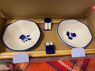 Servizio da dolce, frutta o colazione composto da 6 piatti vintage, ma in realtà mai utilizzati quindi totalmente nuovi. Ci sono 2 piatti italiani in maiolica dipinti a mano con frutta; 2 piatti in maiolica sempre dipinta a mano in bianco e blu da collezione, Capuani Vecchia Este; e infine ho aggiunto 2 piattini sempre con disegno bianco e blu che credo siano bene nel mix. Le condizioni come vedete Sono eccezionali non ci sono danni difetti sbeccature o graffi. Nel complesso è un servizio molto carino perché ha un gusto un po' rustico ma è di ottima manifattura. Diametro fra 19 e 22 cm.