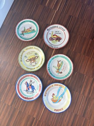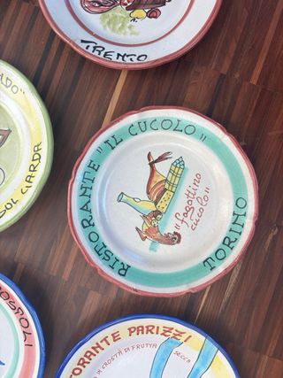 Set di 6 piatti in ceramica dipinti a mano, ognuno con un disegno unico di ristoranti italiani. - Ristorante Il Cucolo - Ristorante Chiesa - Ristorante Piccolo Mondo - Ristorante Il Cucolo - Ristorante 12 Apostoli - Ristorante Parizzi