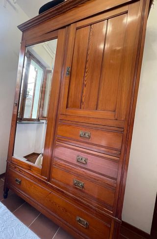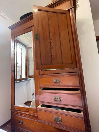 Elegante armadio d'epoca con specchio integrato e pratici cassetti. - Struttura in legno massello. - Ante con pannelli verticali. - Maniglie in metallo dorato. - Specchio a tutta altezza su un'anta. ritiro in zona o spedizione a carico dell’acquirente