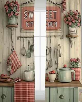 Coppia di tende in tessuto con un delizioso stile vintage, perfette per aggiungere un tocco di fascino retrò alla tua casa. - Motivo a quadri rossi e bianchi. - Dettagli floreali rosa. - Design country chic.