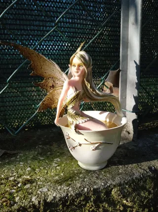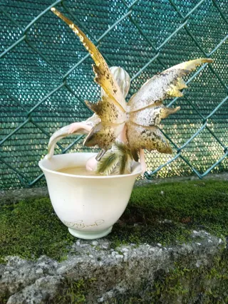 Deliziosa tazzina decorativa firmata Amy Brown. Un pezzo unico che aggiunge un tocco di magia. - Design con ali dorate e dettagli floreali. - Tonalità oro e rosa delicate.