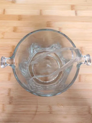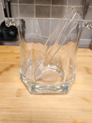 Secchiello per ghiaccio in vetro pesante, design elegante e resistente. Perfetto per servire bevande con stile! Inclusa pinza in vetro acrilico, pratica e leggera. Ottime condizioni, ideale per occasioni speciali o per un angolo bar raffinato. Altezza 13 cm.