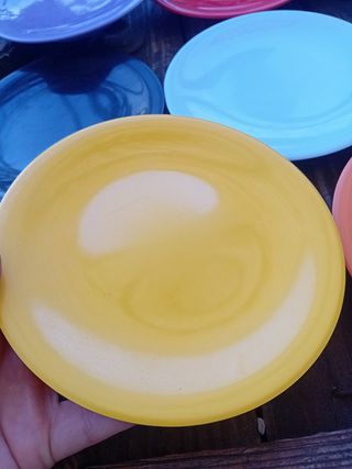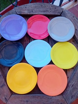 piattini in plastica rigida. di 8 colori diversi per dessert per mettere un muffin o biscotti o qualche stuzzichino salato. rallegrano le giornate per merende o aperitivi. qualche graffio ma i colori sono accesi. lavabili in lavastoviglie. oltre questi ne ho altri. diametro 15cm. 1,20 € l uno giallo-rosso-arancione-celeste-nero-grigio-viola-verde