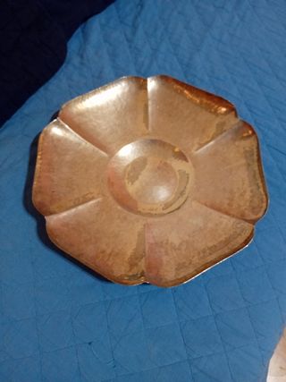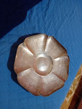 STUPENDO CENTROTAVOLA A FORMA DI FIORE IN SILVER PLATED. E' PRODOTTA DALLA FAMOSA DITTA DI ARGENTERIA ITALIANA OLRI. E' SEMPLICE MA MOLTO RAFFINATA, A FORMA DI FIORE. IL FONDO E' INTERAMENTE MARTELLATO A MANO. MISURA 35 cm DI DIAMETRO E 5 cm DI ALTEZZA. L'ARTICOLO E' PUNZONATO .
