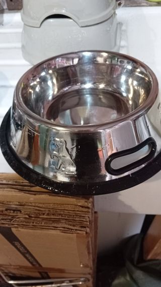 Tre ciotole in acciaio antirovesciamento , una grade 0,9 litri due piccole o,45 , ( una con qualche puntina di ruggine esterna, interna perfetta) gommina antiscivolo leggermente rovinata. Sono nuove conservate da anni in cantina.