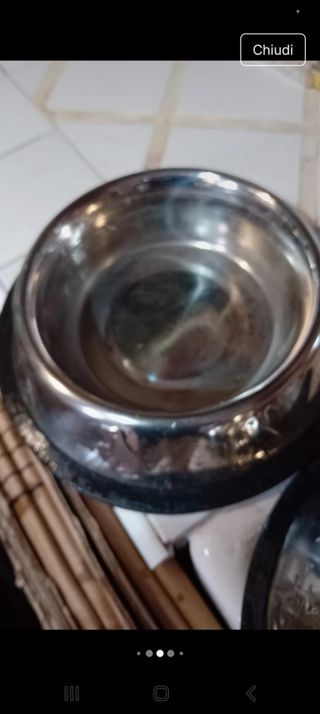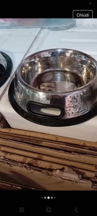 Vendo 3 ciotole per cani in acciaio. Sono in buone condizioni, perfette per i vostri amici a quattro zampe! - Ciotole in metallo. - Adatte per cani di tutte le taglie. - Facili da pulire. antirovesciamento , una grade 0,9 litri due piccole o,45 , ( una con qualche puntina di ruggine esterna, interna perfetta) gommina antiscivolo leggermente rovinata. Sono nuove conservate da anni in cantina.