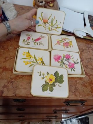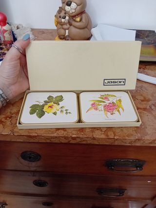 Bellissimo set di sottobicchieri vintage del marchio Jason. Sono realizzati in sughero e carta, e presentano immagini di fiori. Il set include 6 sottobicchieri, ognuno con un disegno floreale diverso. Sono in ottime condizioni, perfetti per aggiungere un tocco di eleganza alla tua casa. - Motivo floreale - Design vintage - Perfetti per uso quotidiano