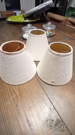 Set di tre paralumi in tessuto, colore bianco/beige. Sono in buone condizioni, leggermente usati. Misure: diametro 14 cm 7 cm. Perfetti per rinnovare le vostre lampade! Macchie di conservazione.