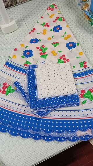 Bellissimo set composto da una tovaglia rotonda e otto tovaglioli. Perfetti per una cucina dallo stile fresco e romantico. - Tovaglia con stampa floreale e a pois. - Ottimo stato di conservazione. - Ideale per cene e pranzi in famiglia. 152 cm diametro