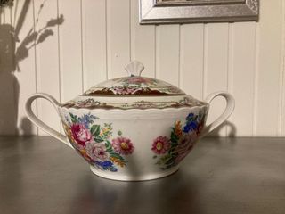 Zuppiera in porcellana fine dipinta con motivo floreale completa di coperchiò e due manigliette Praticamente nuova mai usata