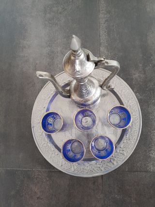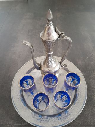 Un po usurata la teiera per il resto tutto in ottime condizioni. Teiera e vassoio placcati in argento con decorazioni.