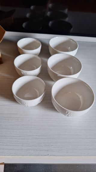 Bellissimo set di sei ciotole Mulino Bianco, in porcellana bianca. Sono perfette per servire snack, dessert o piccole porzioni di cibo. - Le ciotole presentano un delicato motivo a rilievo. - Ideali per un utilizzo quotidiano o per occasioni speciali. - Sono in ottime condizioni.