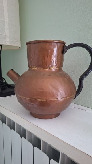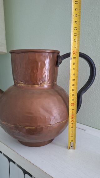 Bellissima brocca in rame, dal design rustico e ricco di fascino. - Manico in ferro nero. - Presenta segni del tempo che ne aumentano il valore estetico. - Perfetta come elemento decorativo.
