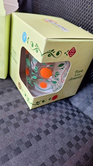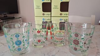 Bellissime tazze Mulino Bianco della linea Armonia. Sono quattro tazze in vetro, decorate con motivi floreali e dettagli arancioni. Perfette per una colazione speciale o per un regalo! - Set di 4 tazze - Motivi floreali e arancioni - In vetro trasparente