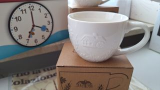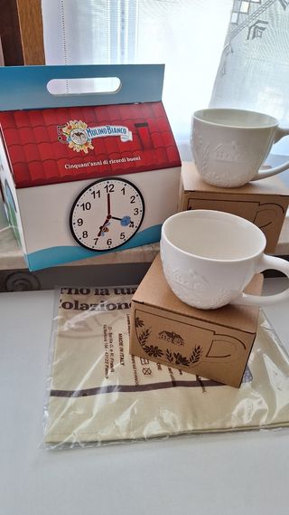 Bellissimo set da colazione Mulino Bianco, perfetto per iniziare la giornata con stile! Il set include due tazze in porcellana e una tovagletta, più casetta in legno ,Le tazze sono decorate con un grazioso motivo a rilievo. Ideali per un regalo o per un uso personale.