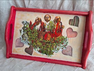 Set di due vassoi in legno con decorazioni natalizie. - Design unico con immagini a tema. - Bordi e manici rossi. - Ideali per un tocco festivo in casa.