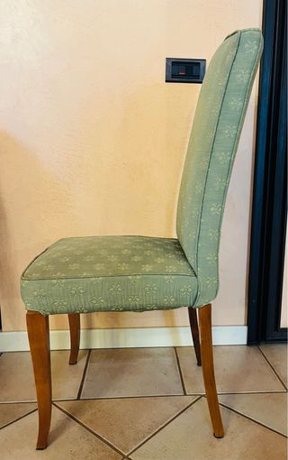 Set da 4 poltroncine imbottite, con schienale alto, ricoperte in seta di colore verde chiaro. Solida struttura in legno massello. Adatte come sedie per sala da pranzo, soggiorno, salotto, sala d'attesa. Condizioni buone. Non spedisco e non consegno a domicilio, il ritiro è a carico dell'acquirente in zona Santa Maria Capua Vetere