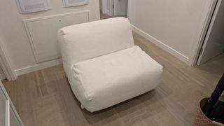 Comoda culla in stile nordico, perfetta per aggiungere un tocco di comfort alla tua casa. Il suo design elegante si adatta a qualsiasi spazio. - Rivestimento in tessuto beige. - Base con gambe in legno.